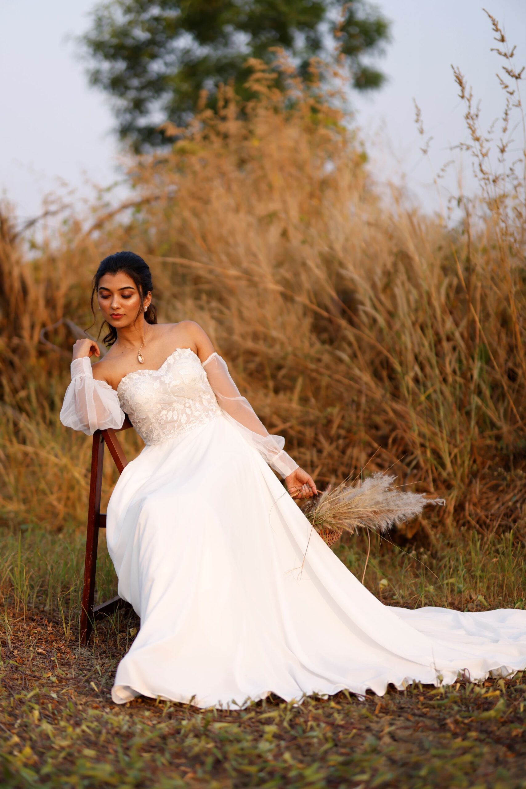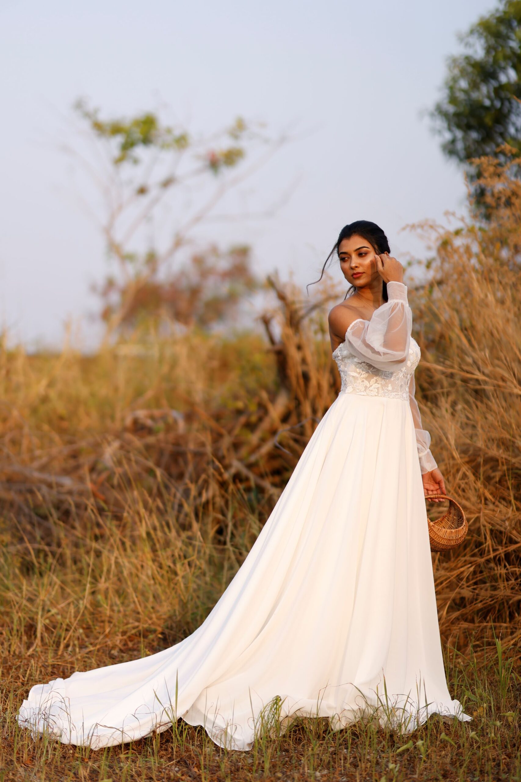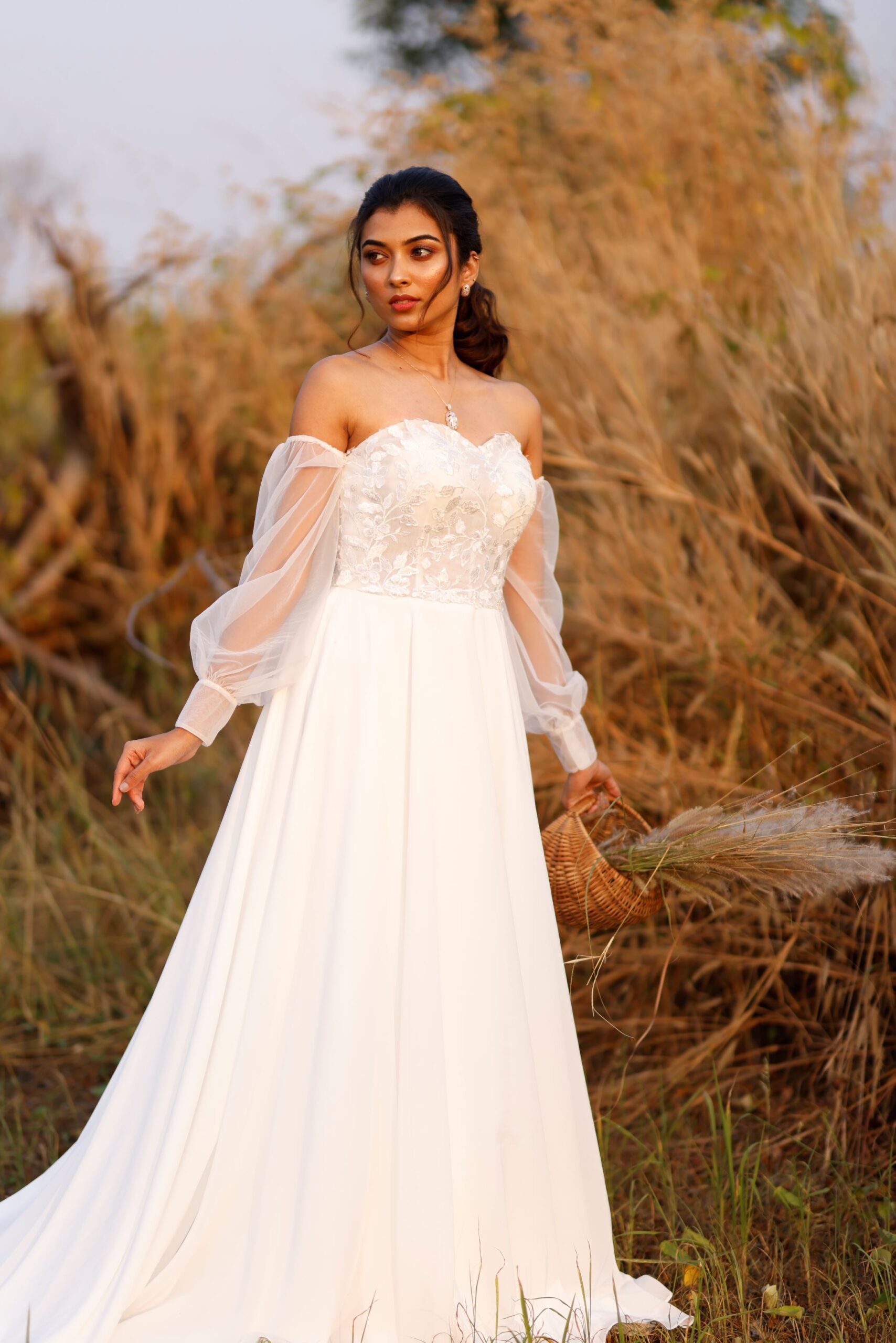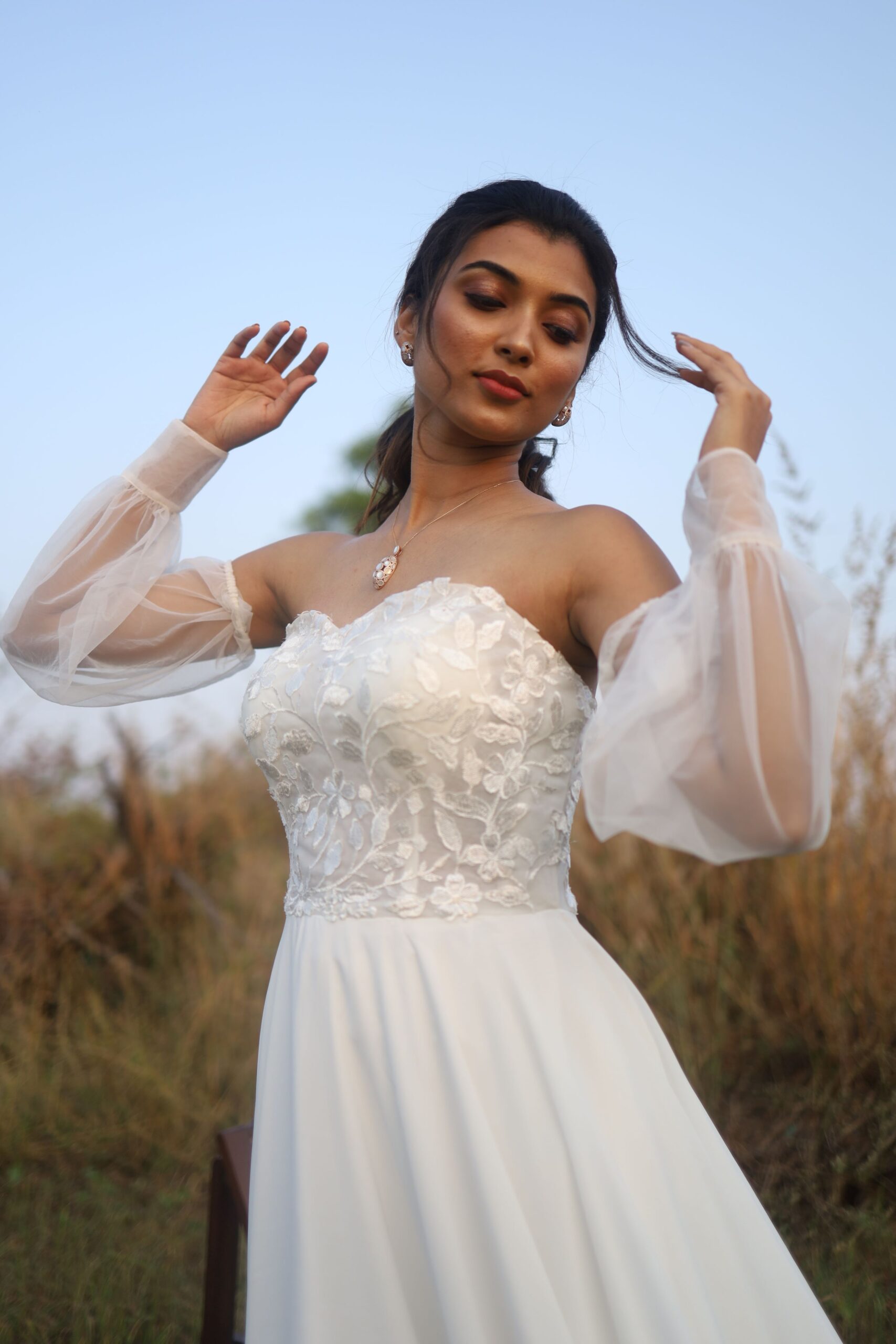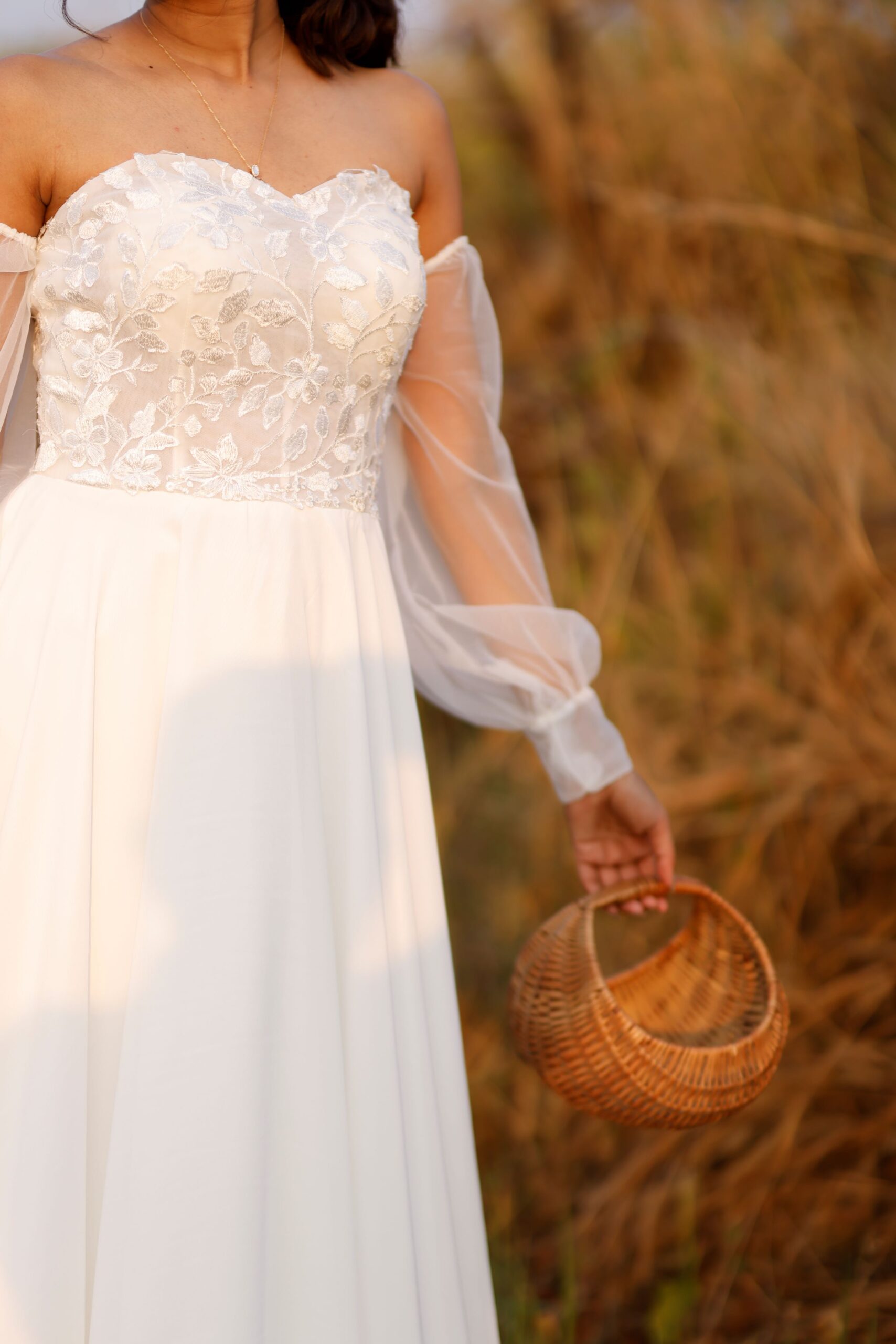 “Brittany” is a gorgeous A-line wedding dress designed to flatter your figure and show off a narrow waistline. This A-line silhouette in chiffon is created by the contrast between the fitted bodice that flows into a full skirt. The bodice features stunning lace appliques on sheer tulle fabric adding a touch of romance. The billowing detachable off-shoulder sleeves are designed to emphasise your neck and shoulders and gives you an added option to wear this as a strapless dress.