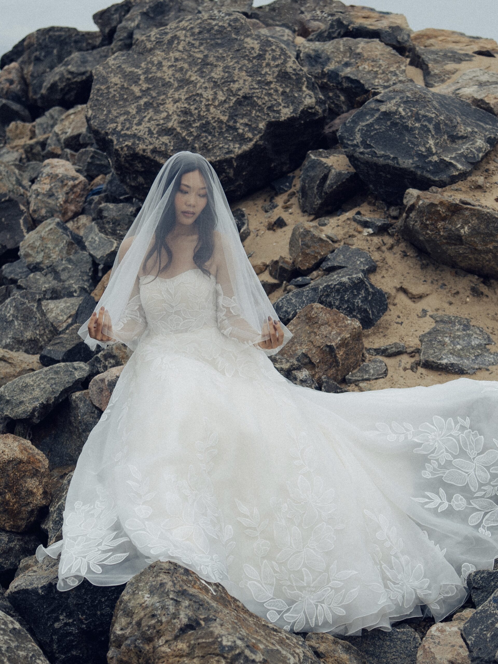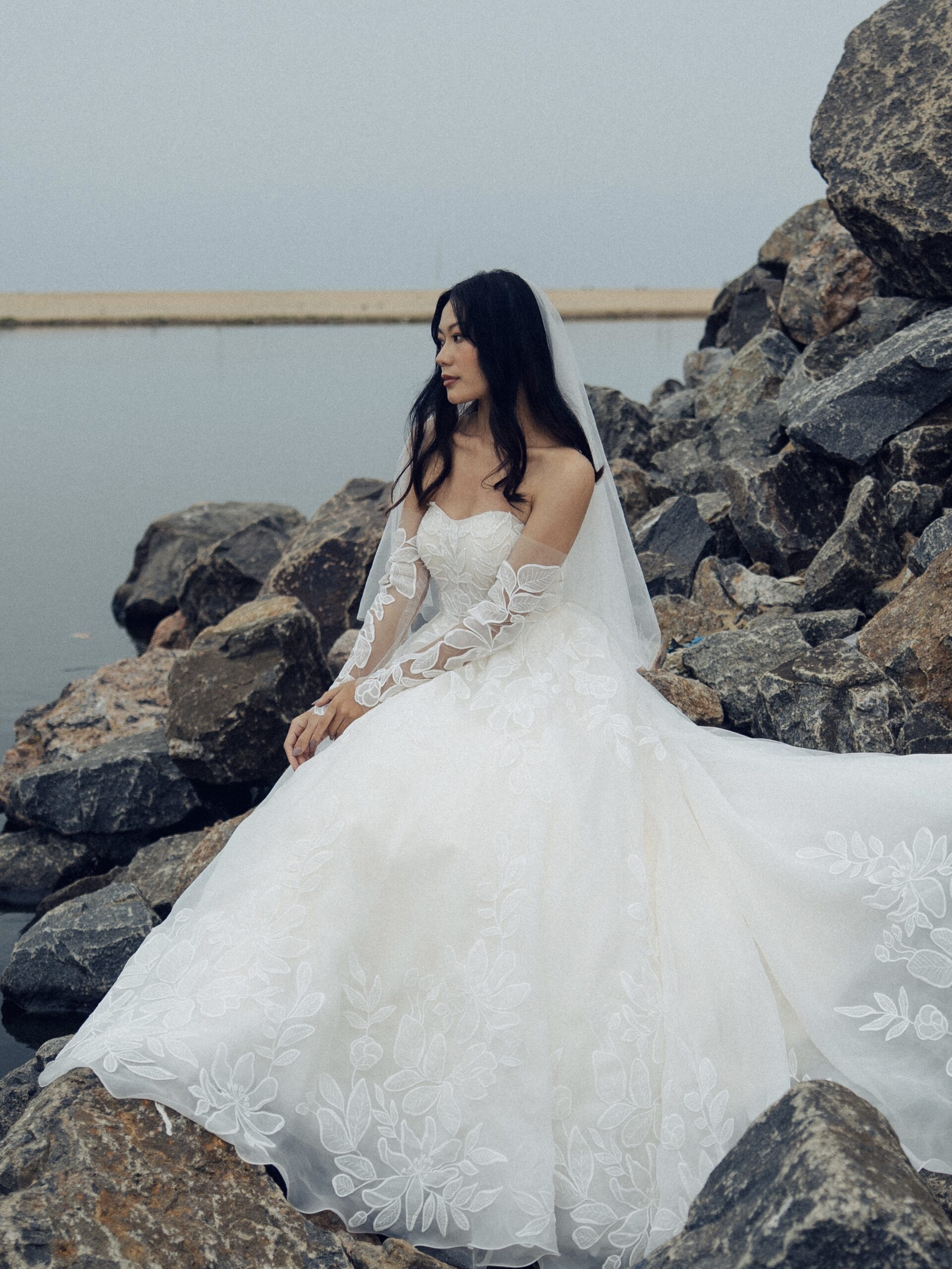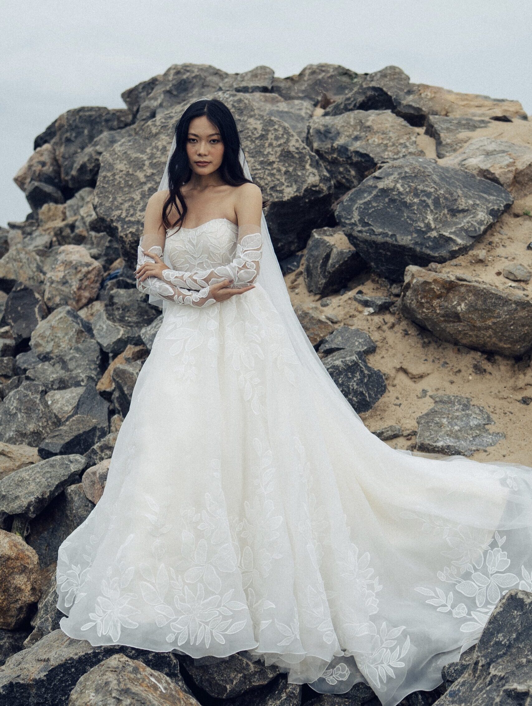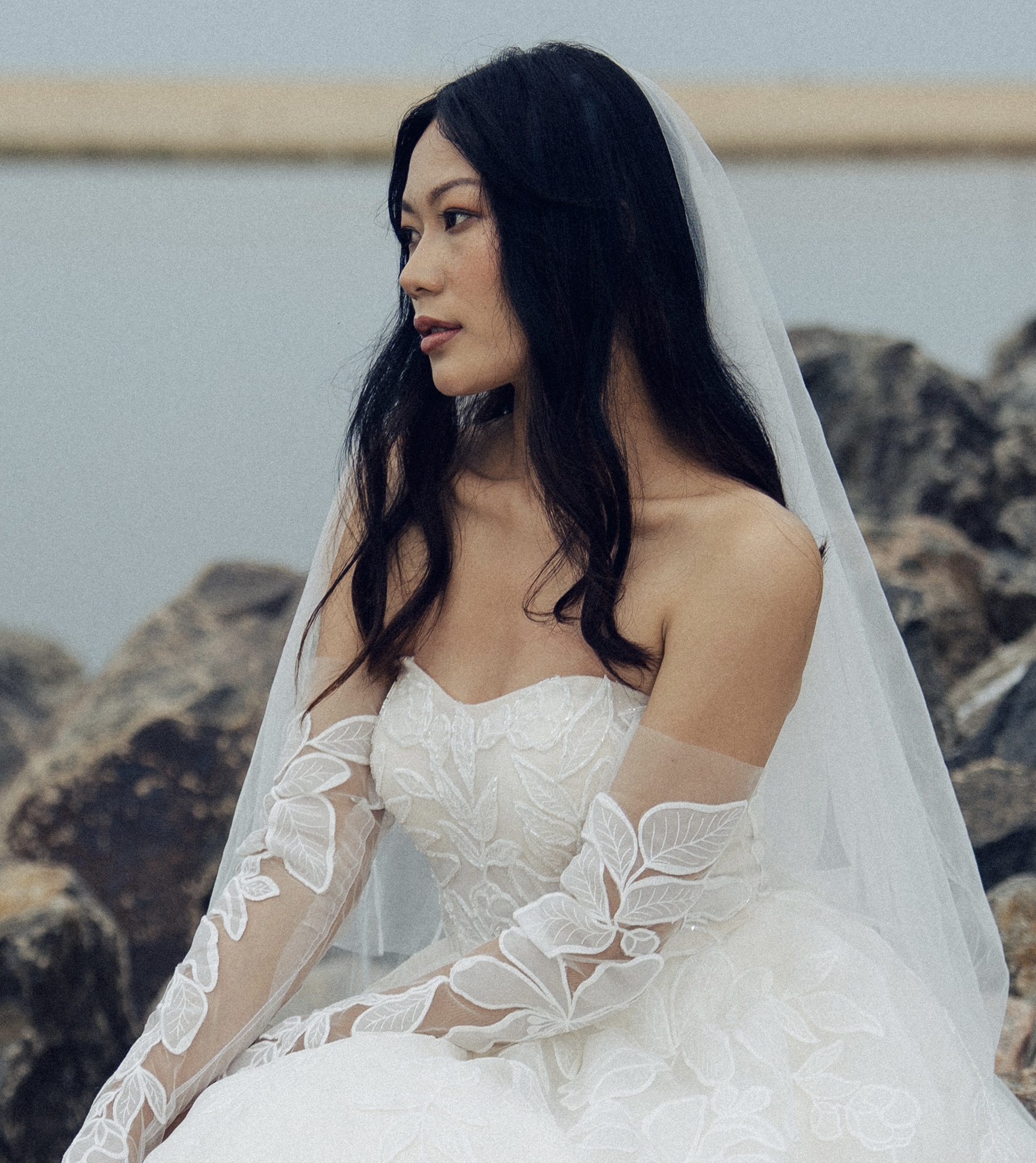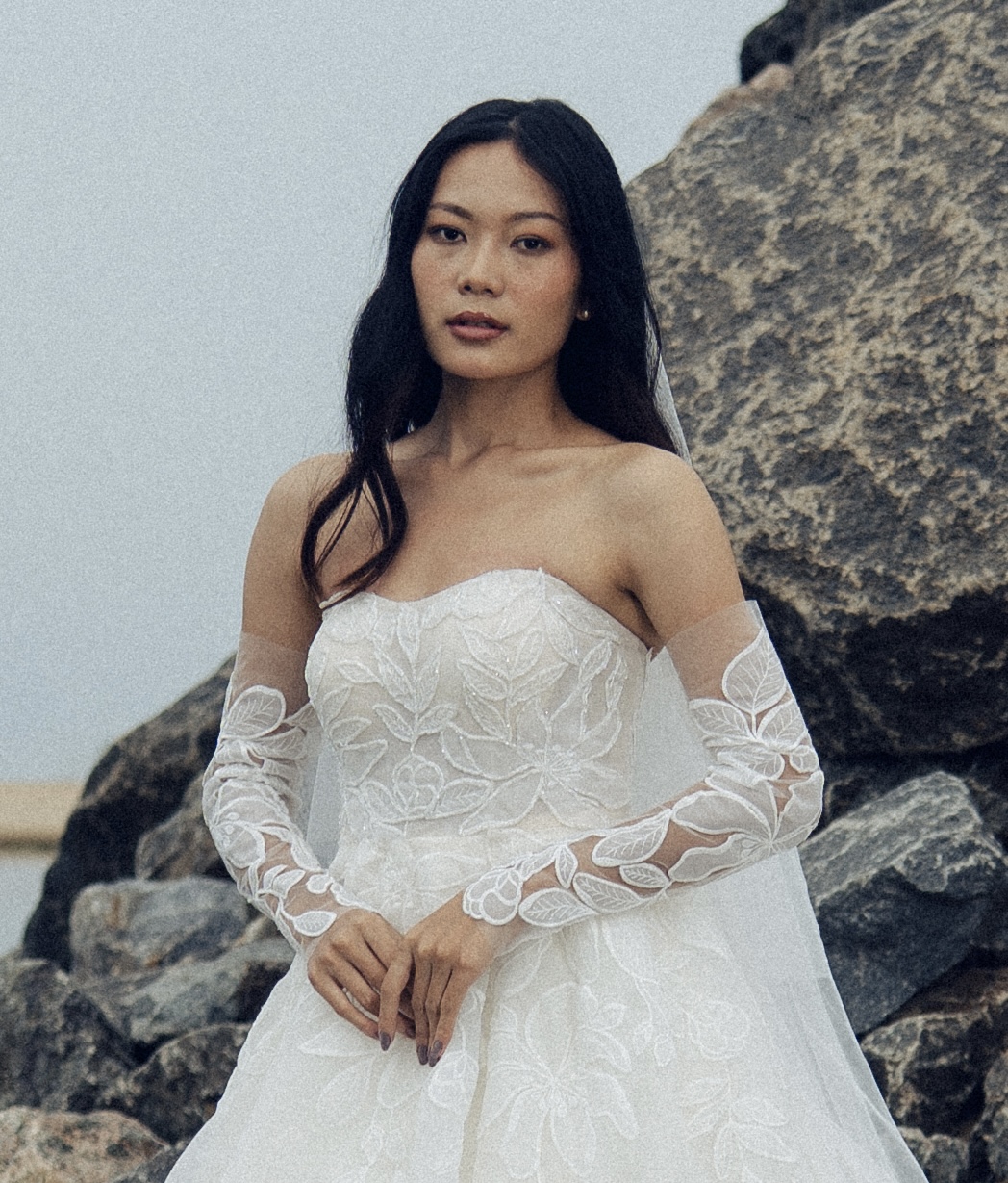 This ivory A-line gown embodies soft romance in airy organza with a graceful, flowing silhouette. The sweetheart neckline adds timeless femininity, while the upper bodice features custom-crafted lace delicately embellished with beadwork for a subtle shimmer. Paired with gloves, the look feels refined, elegant, and beautifully couture-inspired.