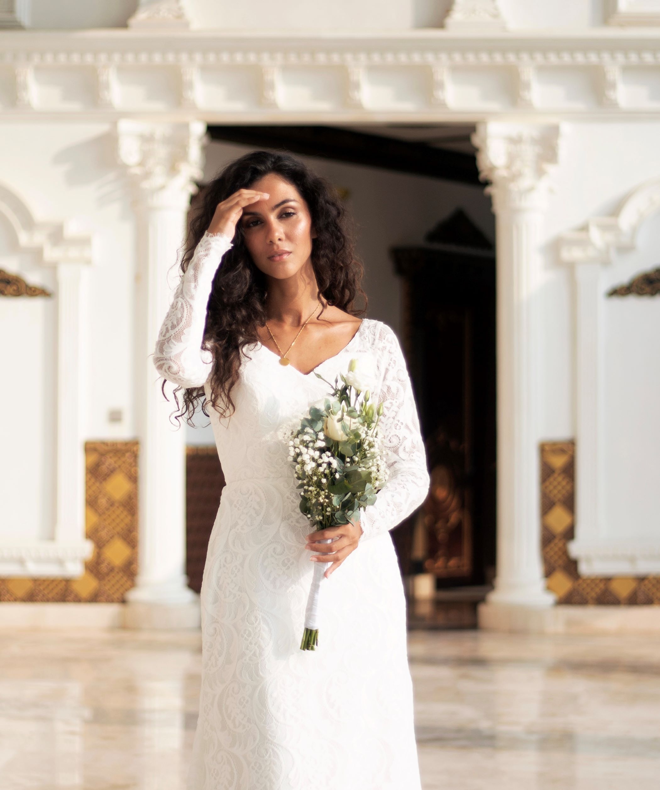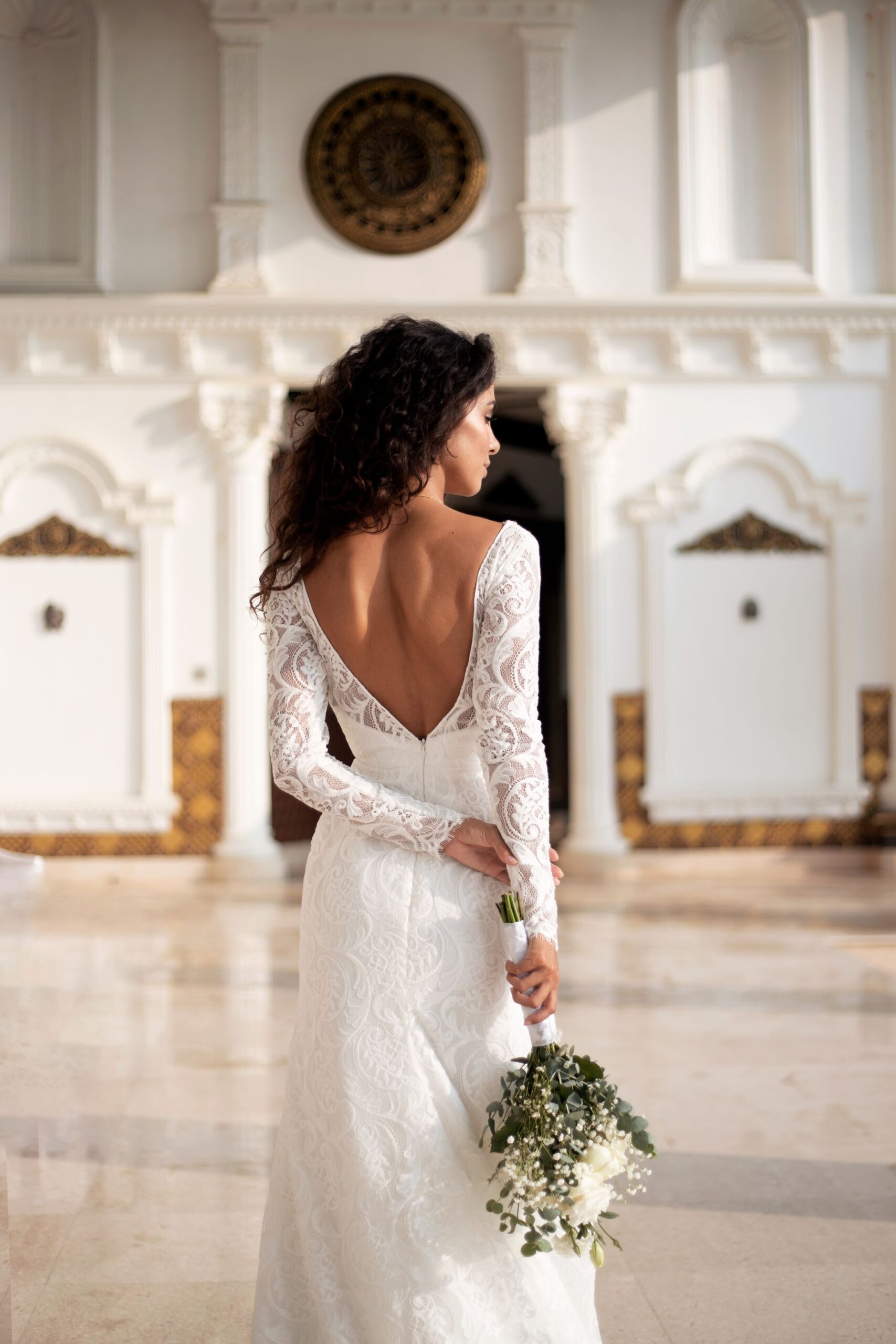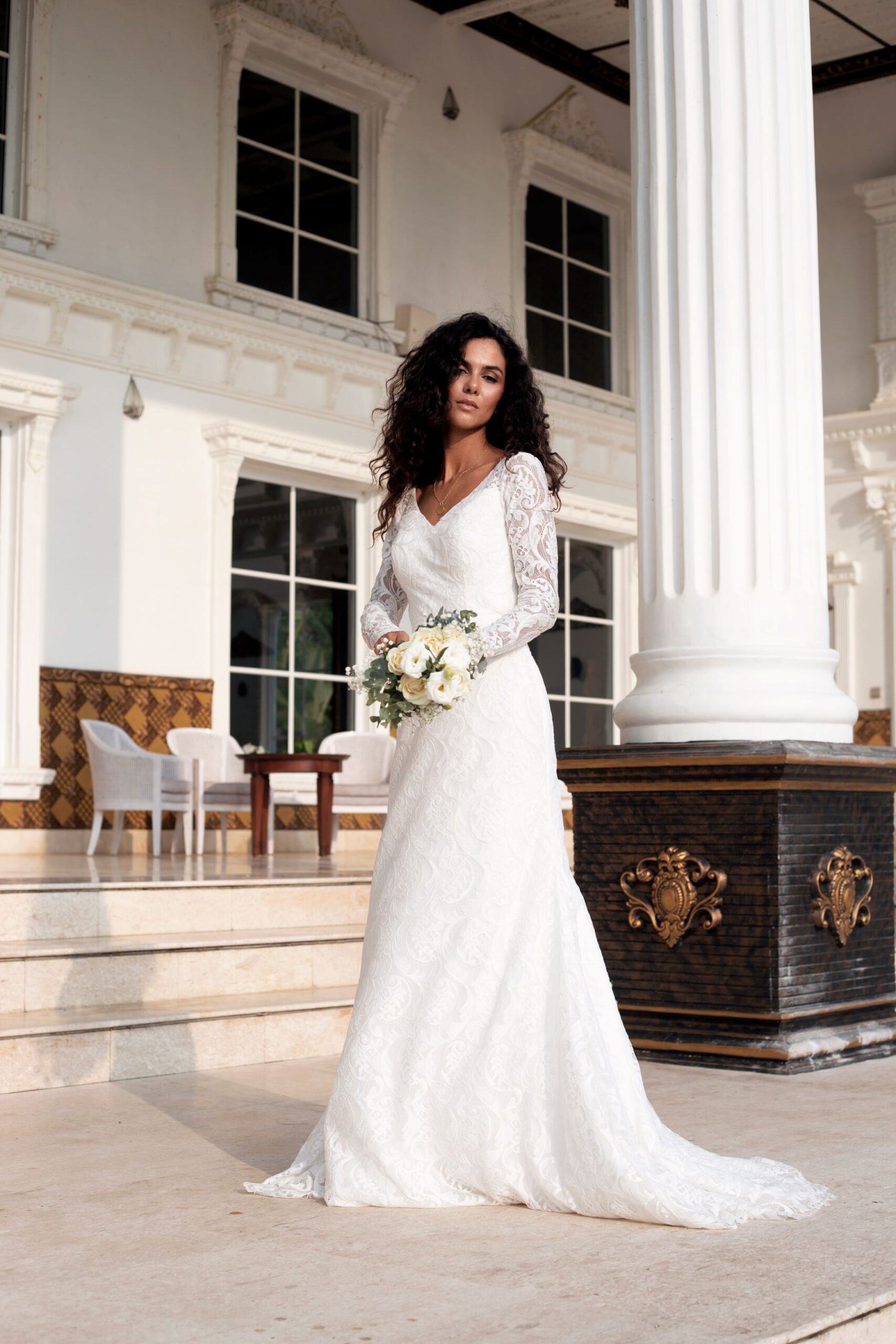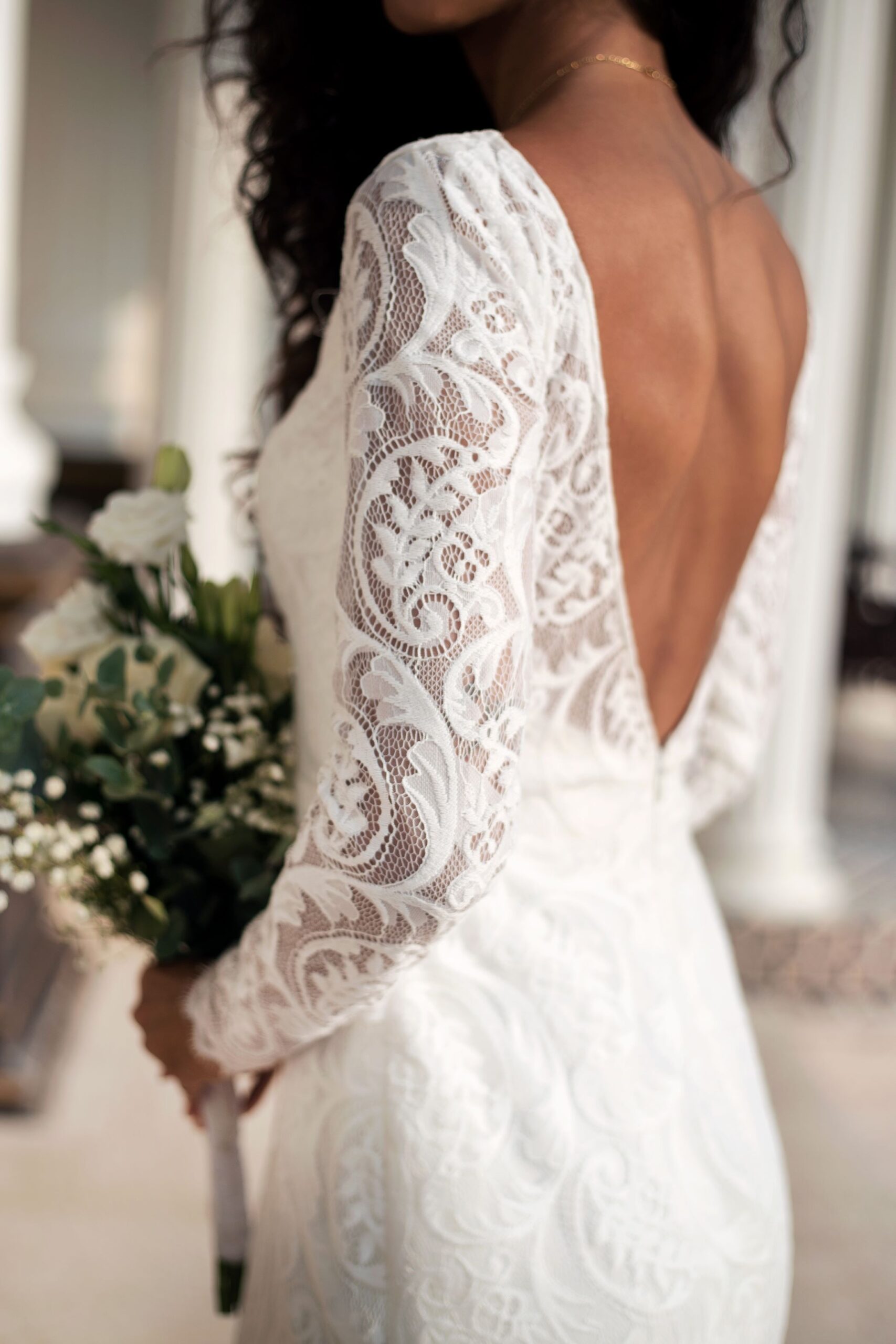 “Cassandra” gown is a backless sheath dress in lace with a simple classic V-neckline and full sleeves with a perfect hourglass silhouette. The delicate lace fabric adds a touch of luxury and texture to the gown’s minimal and sophisticated design.