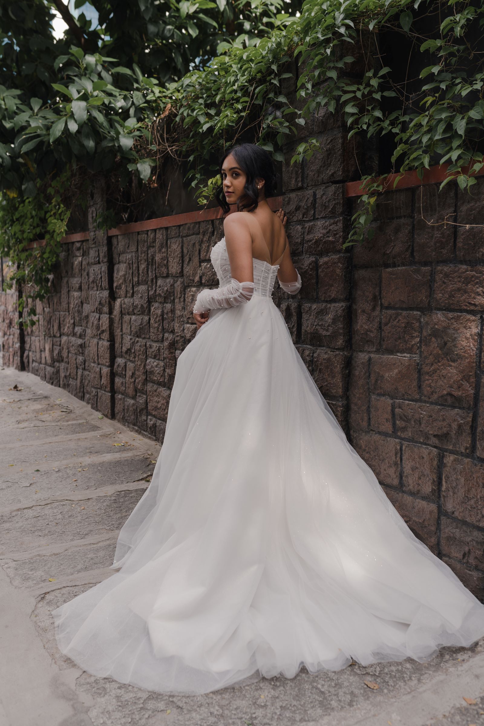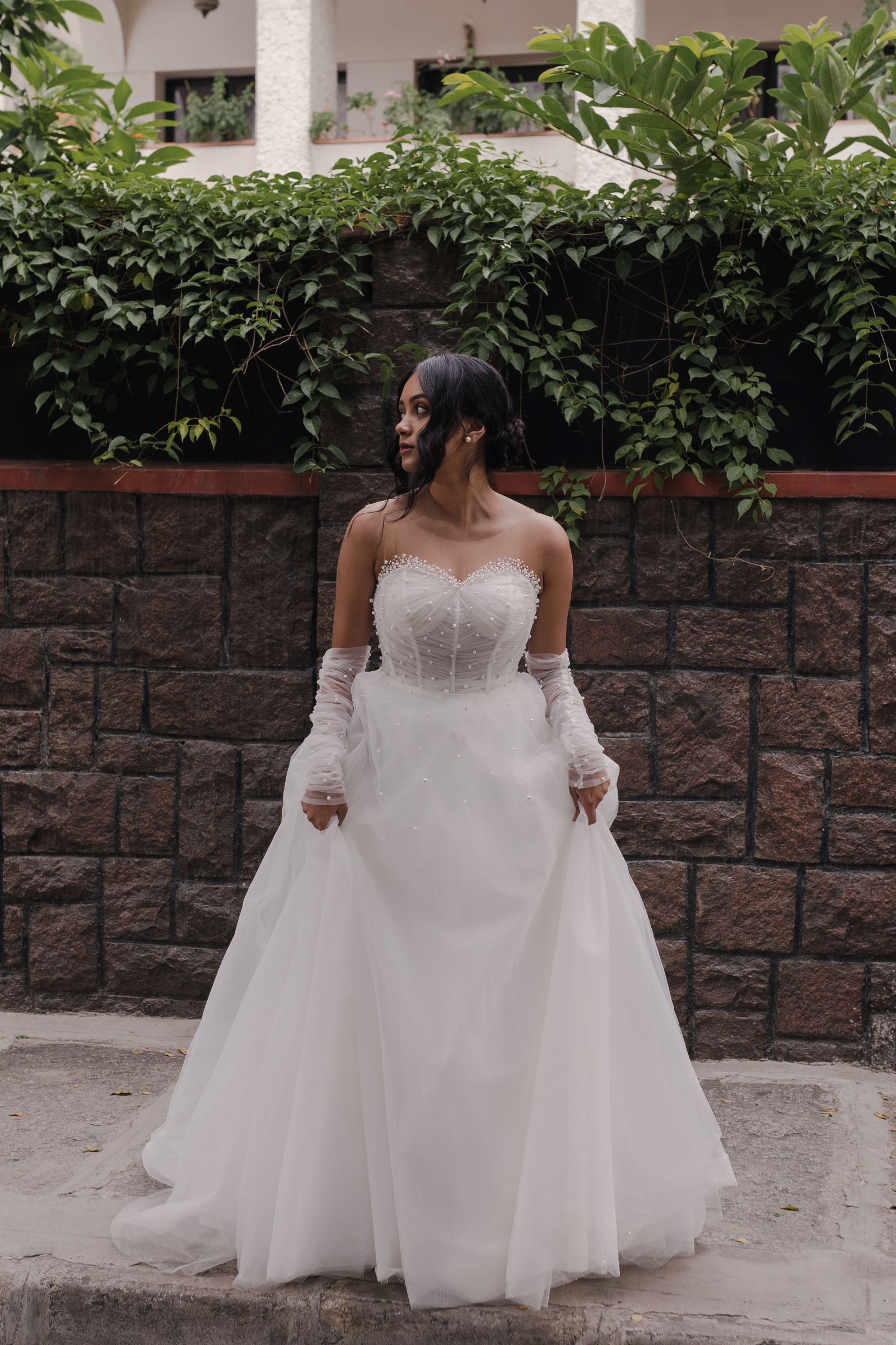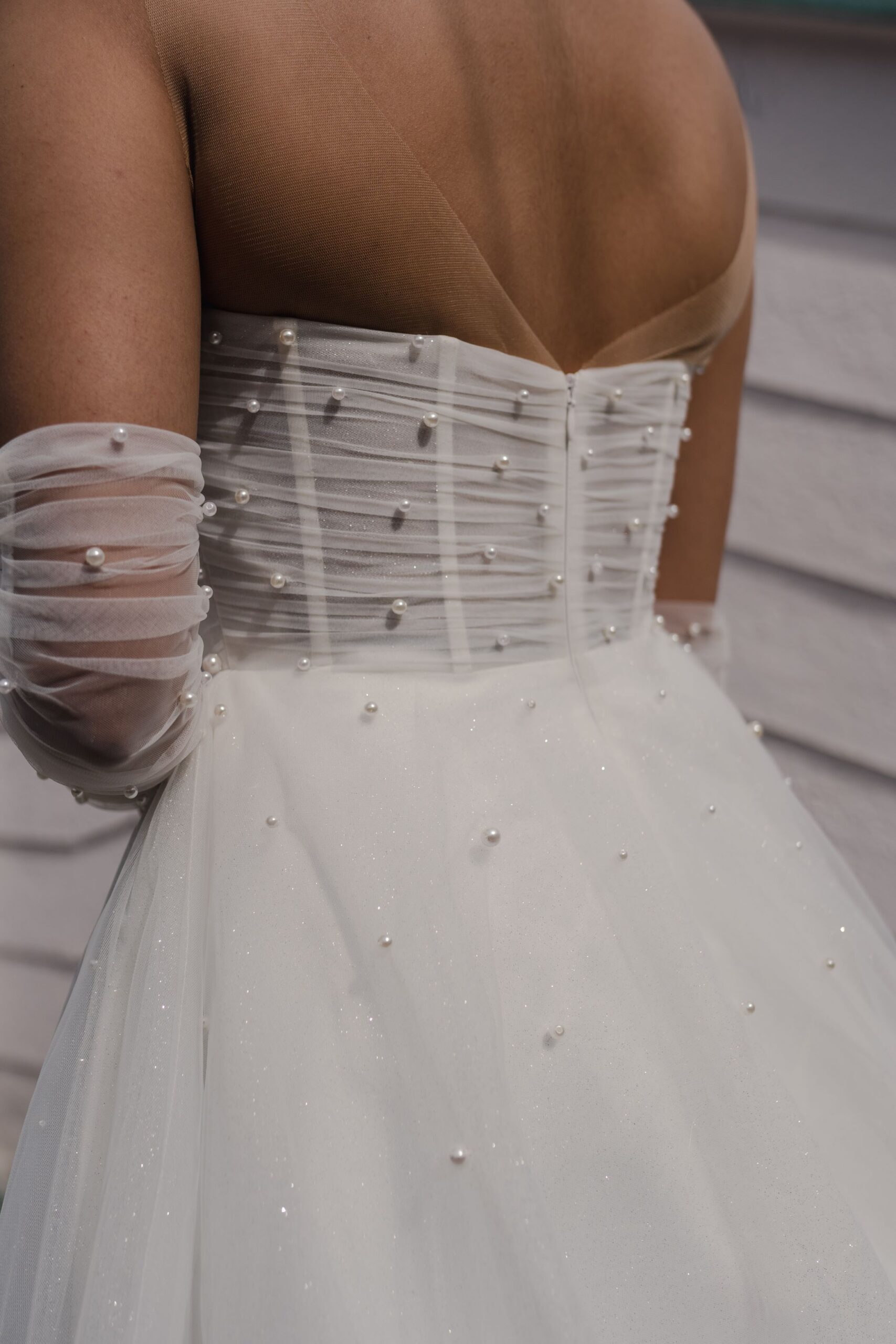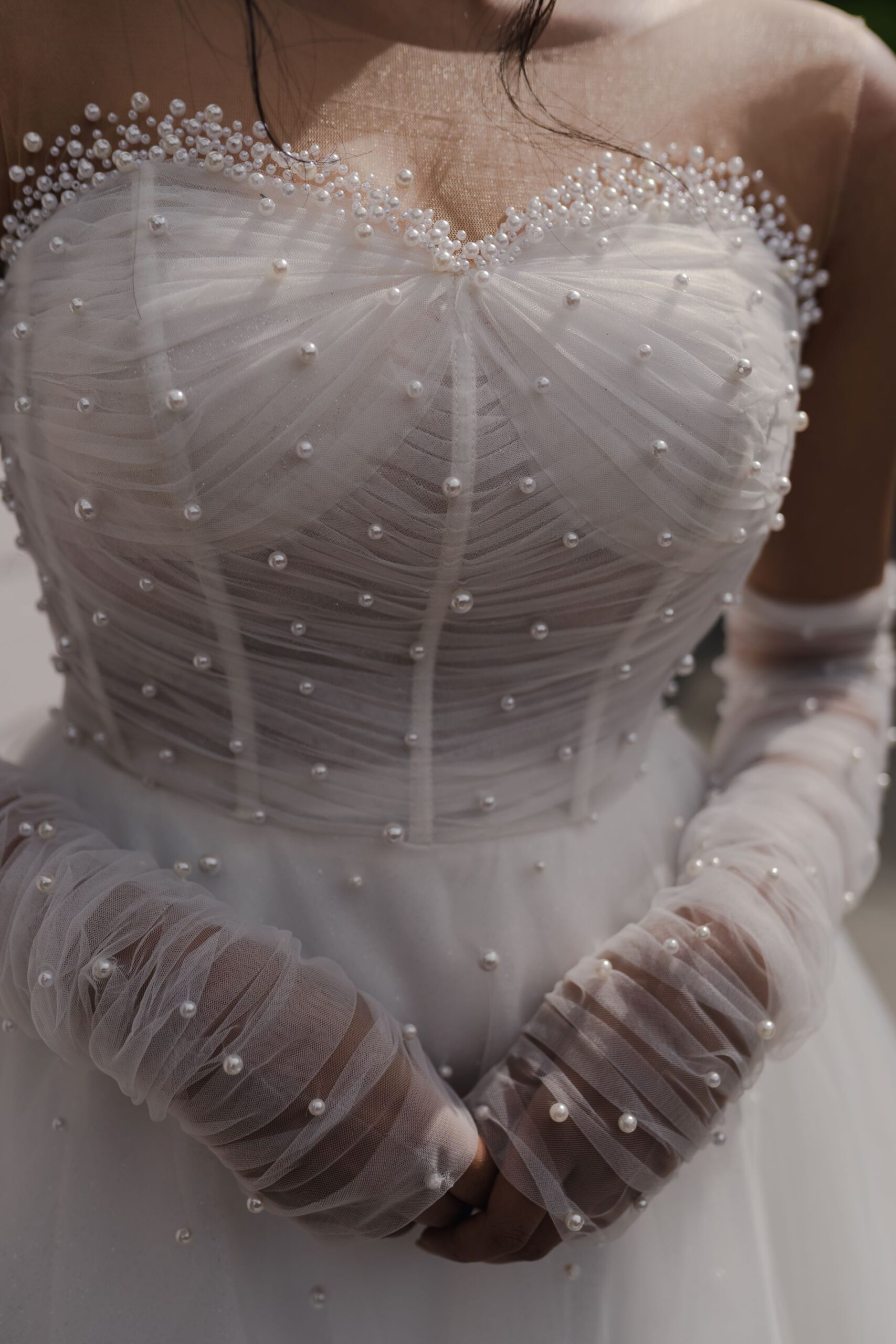 “Diana” is the dream dress for brides who love that light and airy fairytale look. Crafted from light tulle, the bodice of his ball gown is where the magic happens. Designed for a perfect fit, the strapless corset bodice is layered in delicate draped tulle for a touch of soft femininity and shows off both your neck and shoulders while flattering your waistline. The crowning finish comes from the pearls of various sizes that adorn the sweetheart neckline, bodice and elbow-length gloves creating a grand look fit for royalty. It’s the perfect blend of structure and romance to make you feel confident and beautiful on your special day.