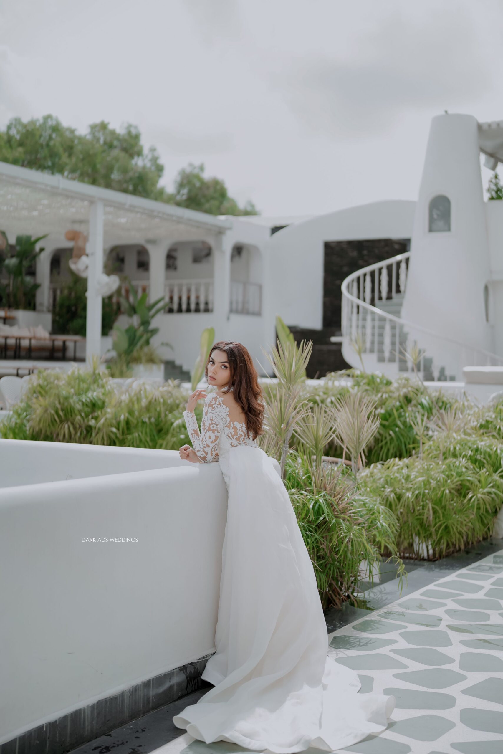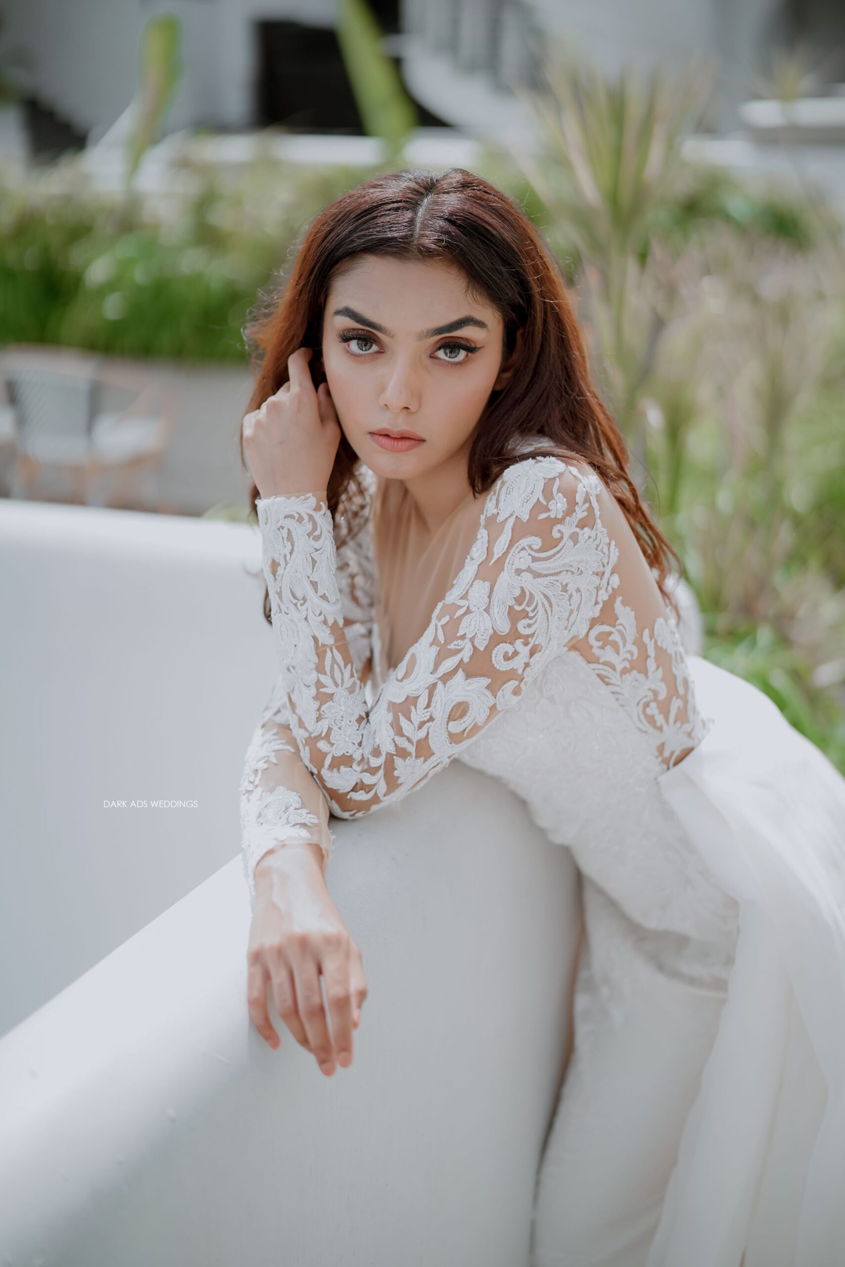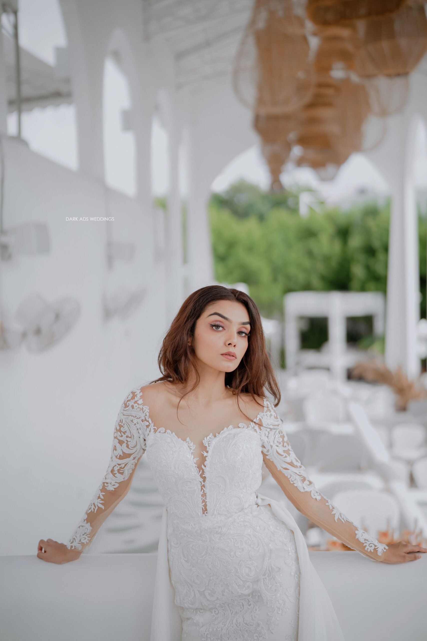 “Fiona” is a tulle mermaid gown with a sexy plunging neckline and intricate handwork. The neckline and full length sleeves in lace contrasts with the bare skin of the neck and shoulders and gives the dress a sense of drama. The sequined lace combination gives it an amazing look. “Fiona” also features an organza outer-skirt to enhance the silhouette making this the perfect dress for brides who want a dress worthy of a fashion magazine.