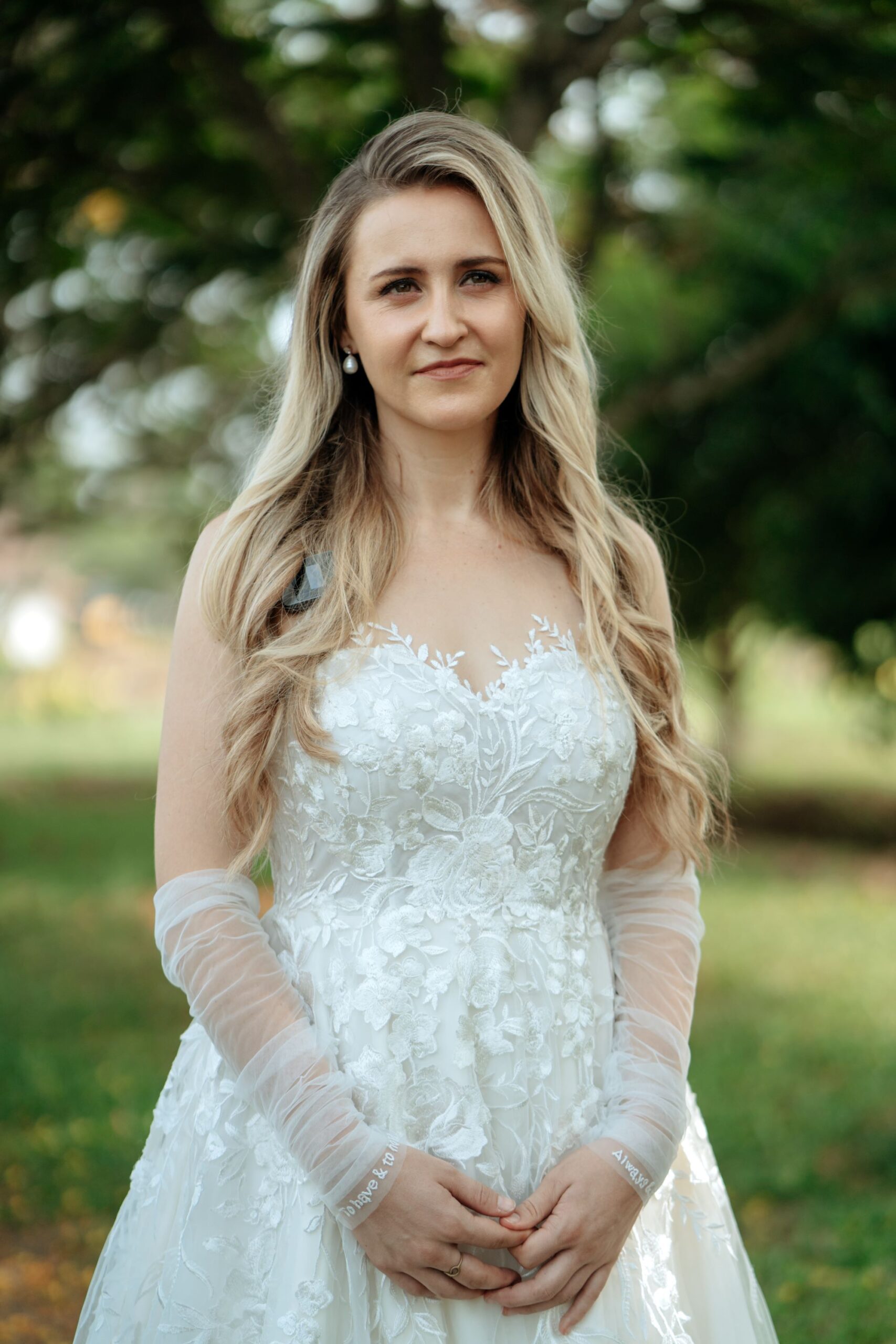 This gown features intricate embroidered lace that adorns the upper bodice and extends gracefully over the skirt, creating a seamless, enchanting flow. The detailed embroidery adds rich texture and enhances the gown’s opulent appeal. The illusion sweetheart neckline blends delicate mesh with lace, offering a romantic and captivating finish.