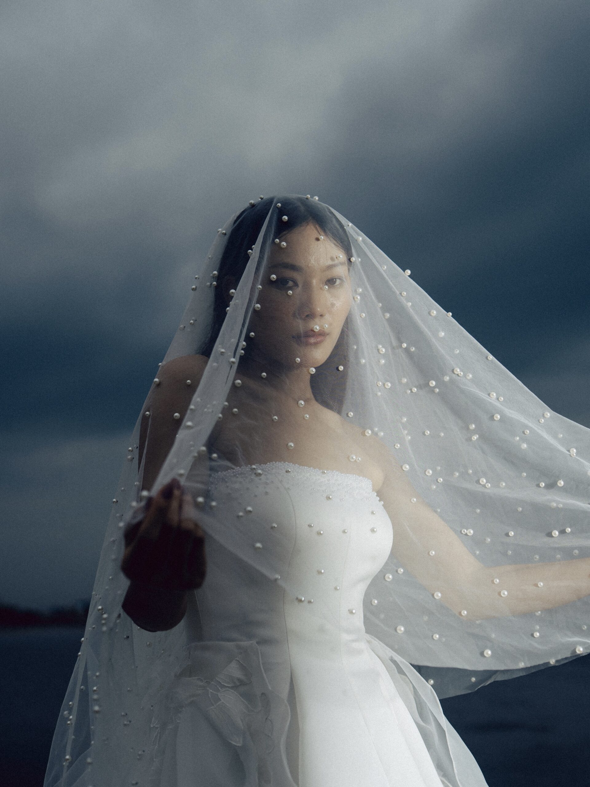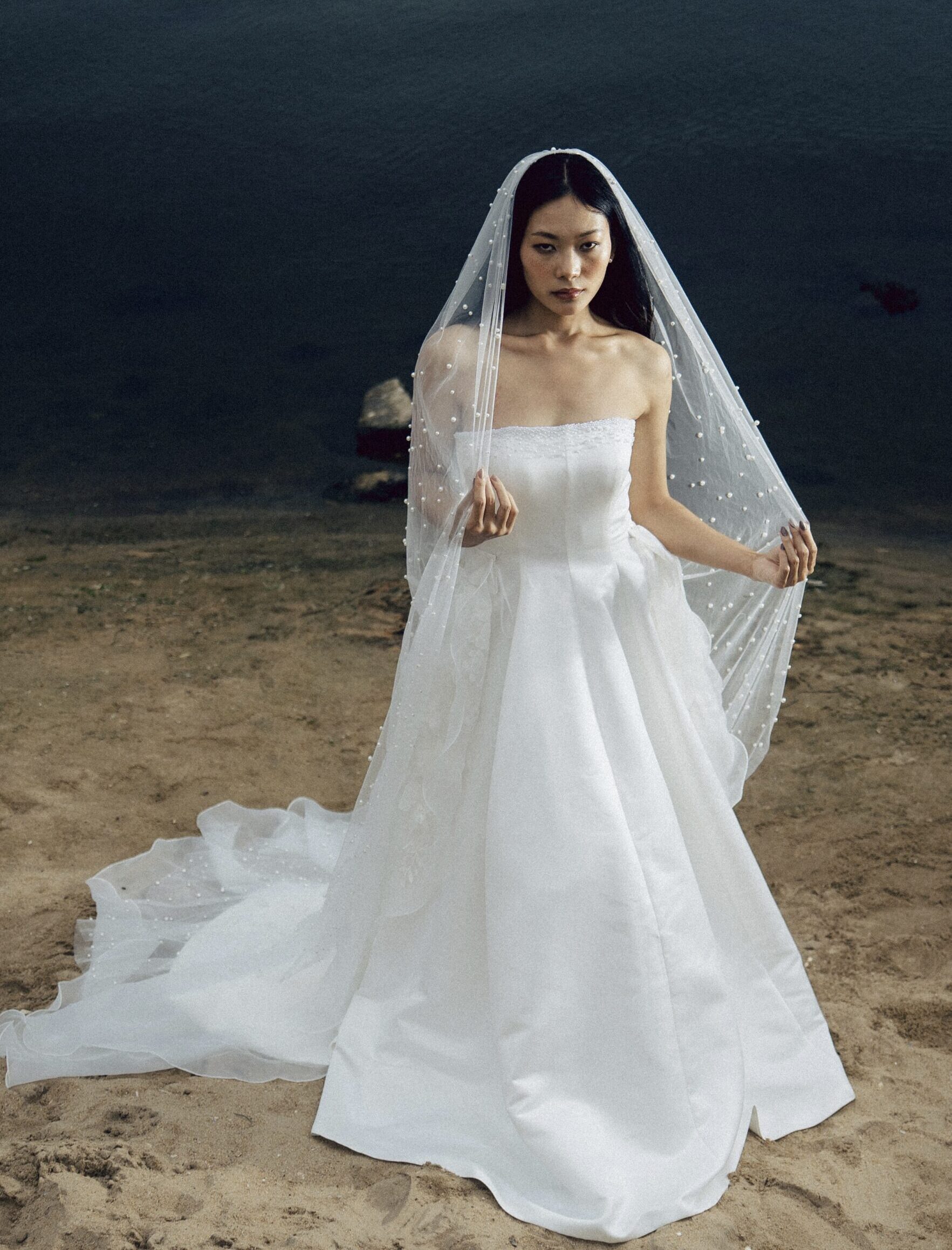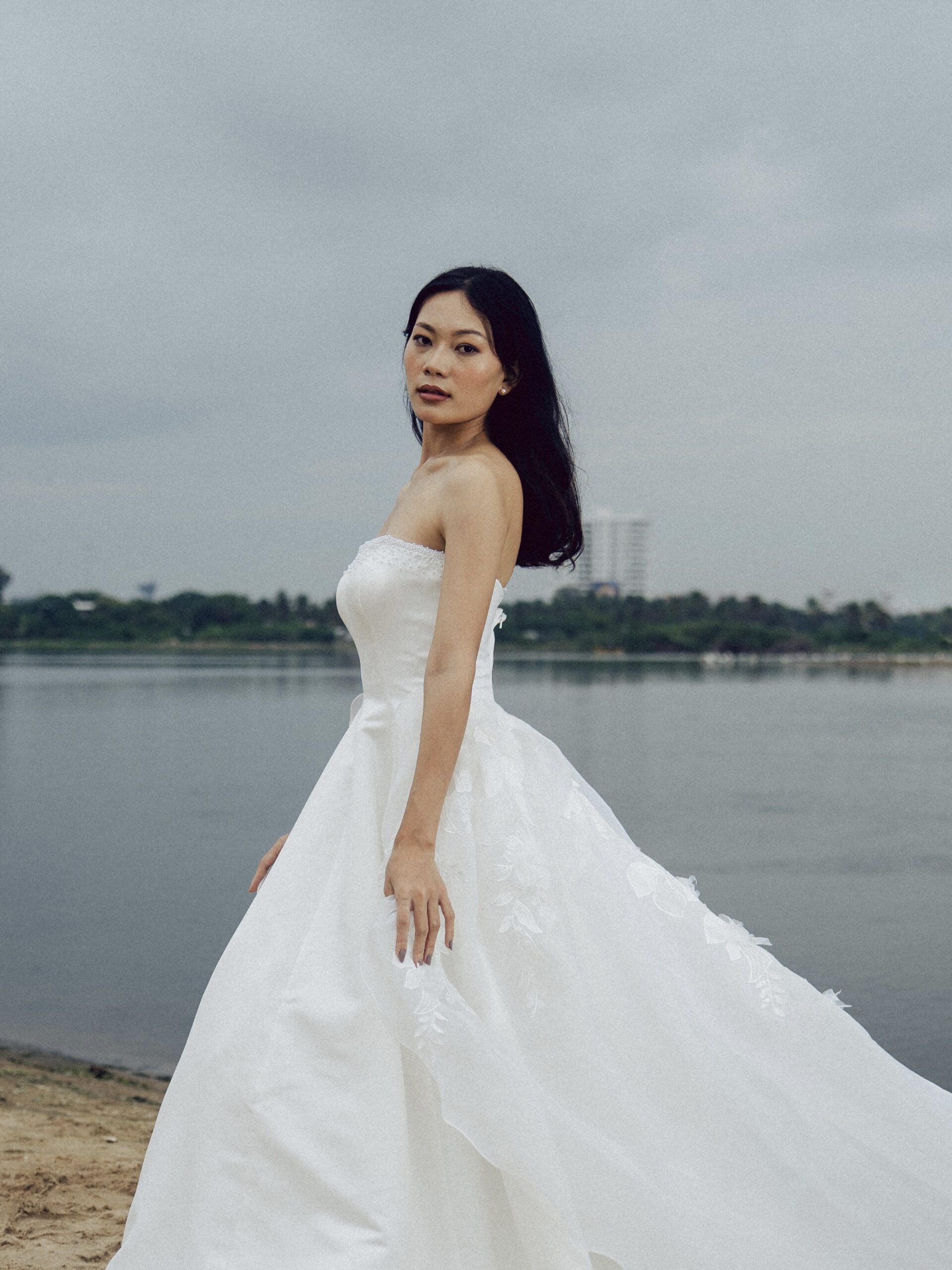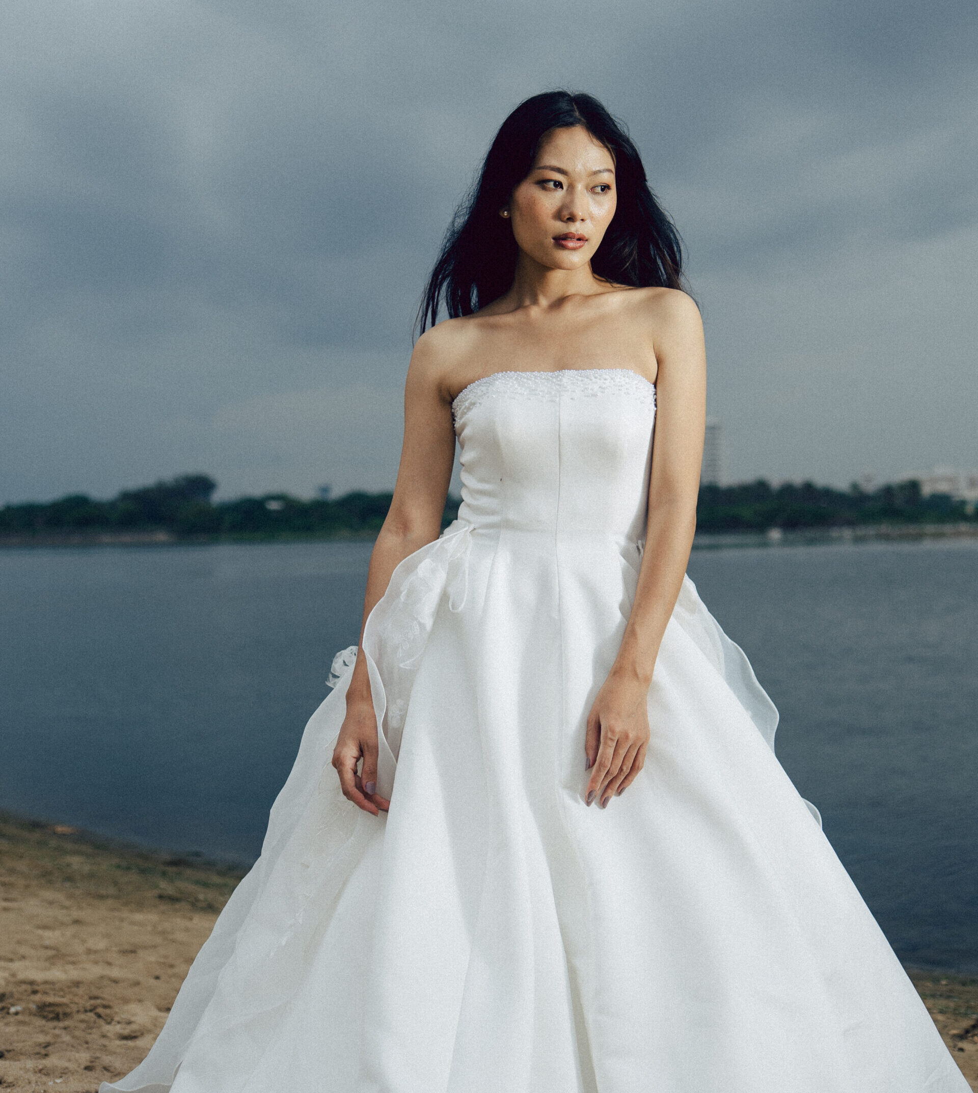 This satin A-line gown exudes timeless elegance with its smooth, luminous finish and classic silhouette. Pearl detailing along the neckline adds refined sophistication, while a sheer organza overskirt with subtle floral accents brings soft romance without overpowering the satin’s graceful simplicity