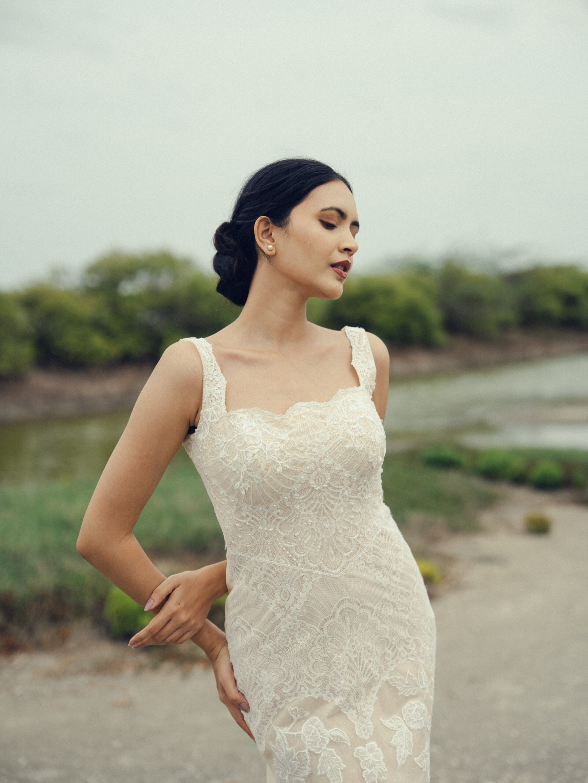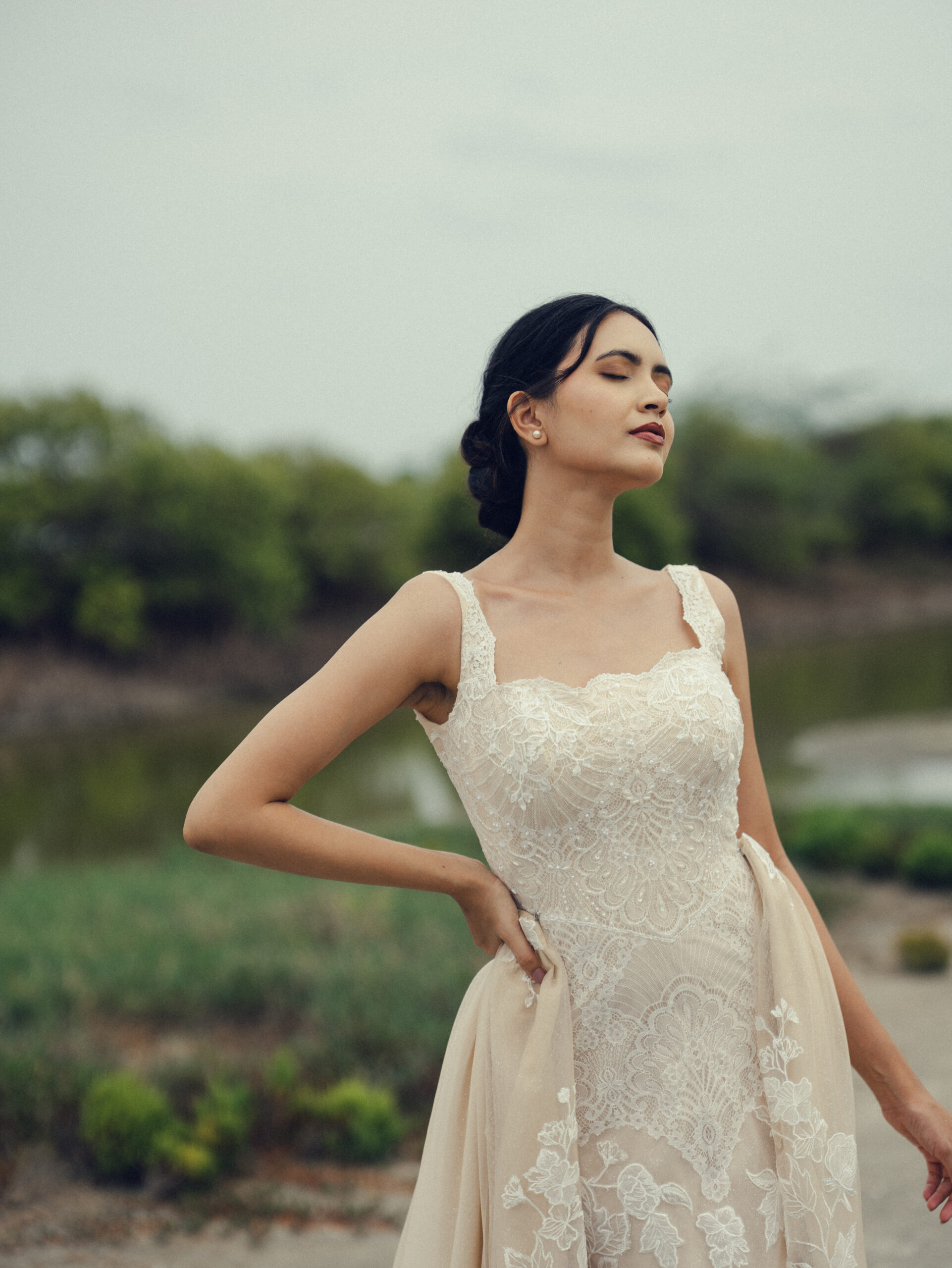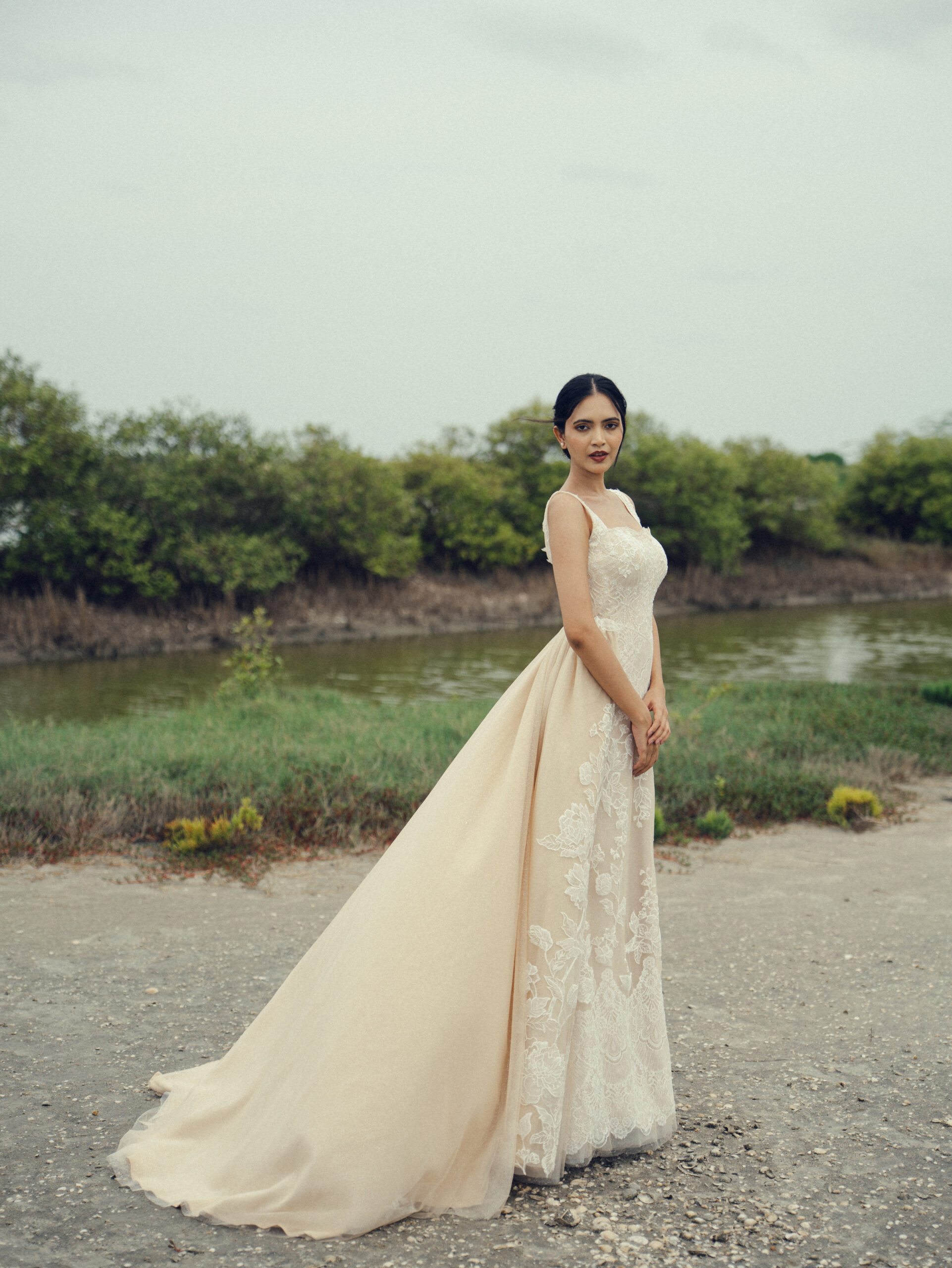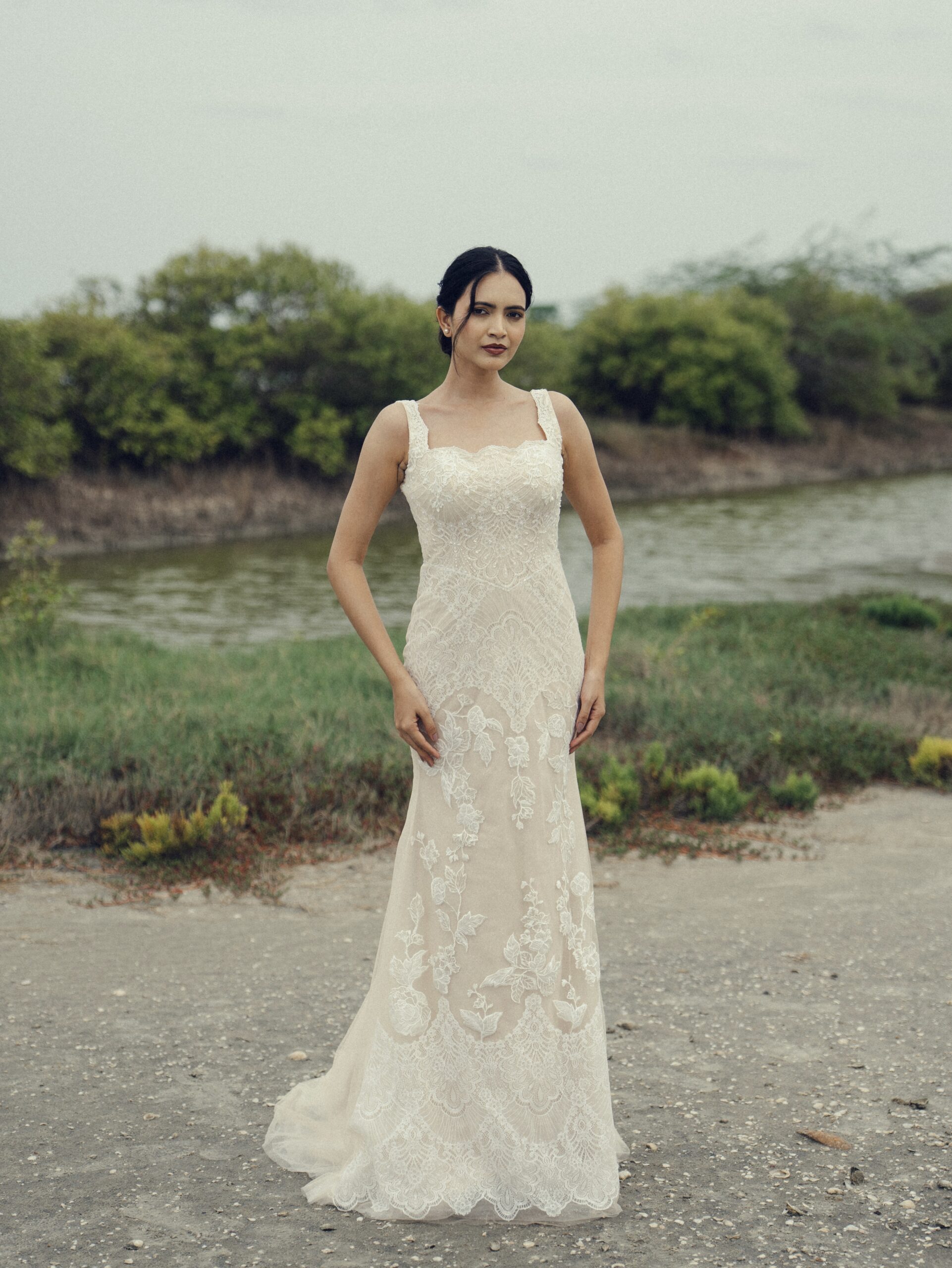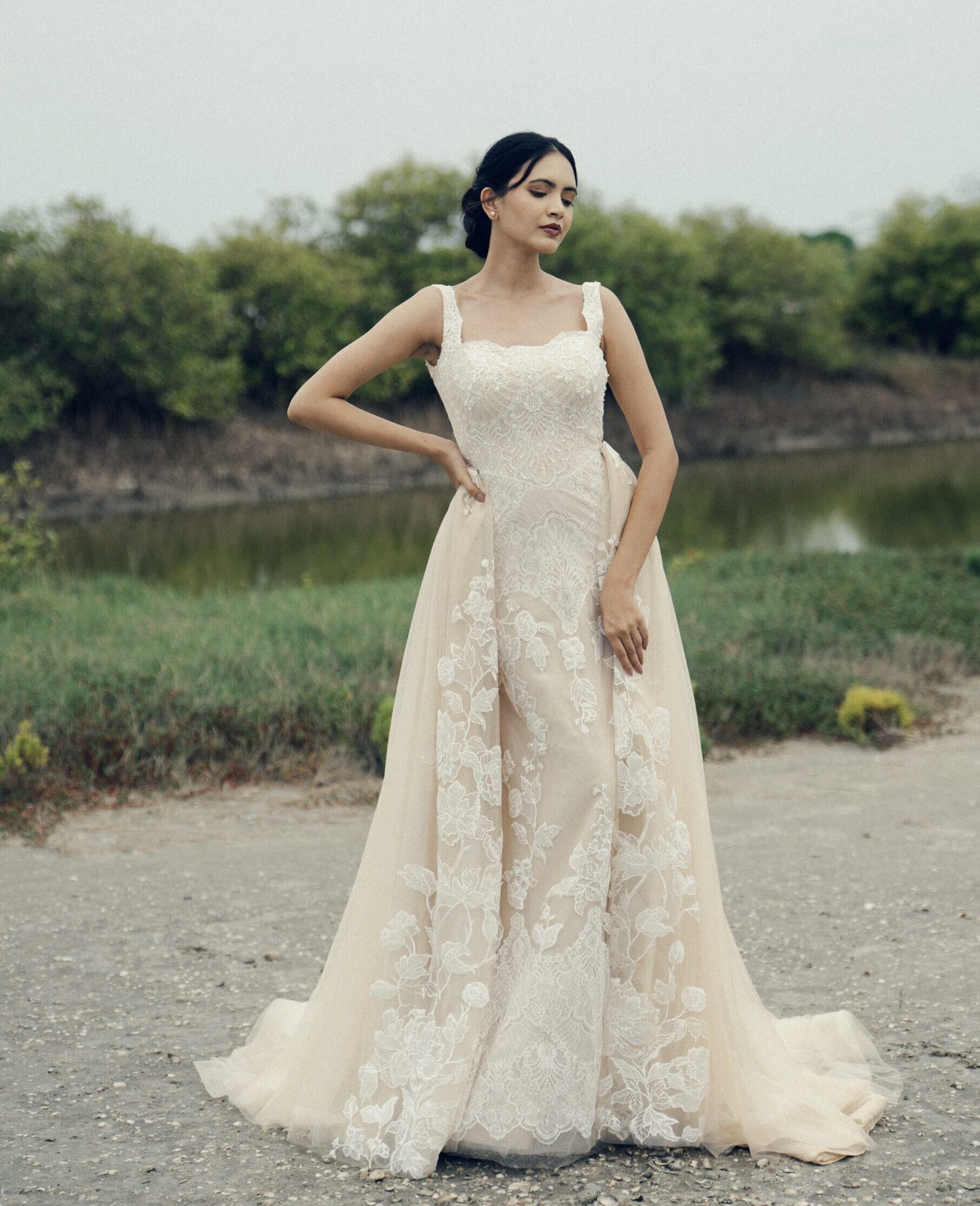 Soft texture and subtle shine come together in this sheath gown, elevated with Chantilly, Lace, intricate handwork and a gentle shimmer. The scalloped neckline adds a romantic finish, while a coordinating lace overskirt introduces movement and dimension, enhancing the look with elegant drama.